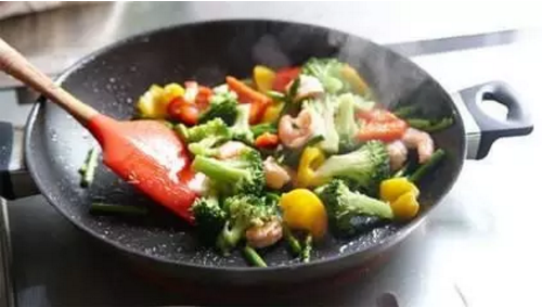 正確做法:每道素菜放油量不超過一湯匙,怕糊鍋可以用平底鍋炒菜,保證受熱均勻。